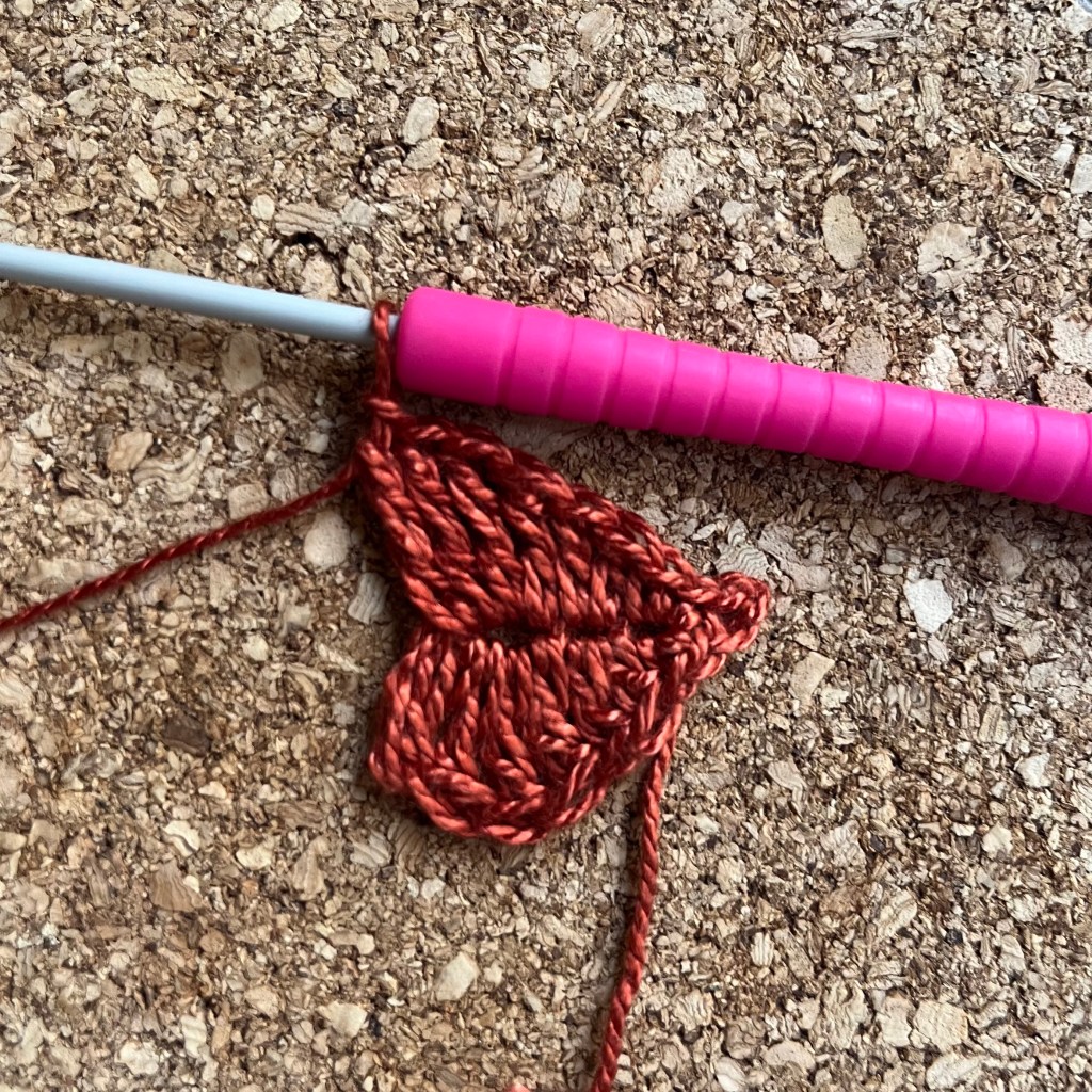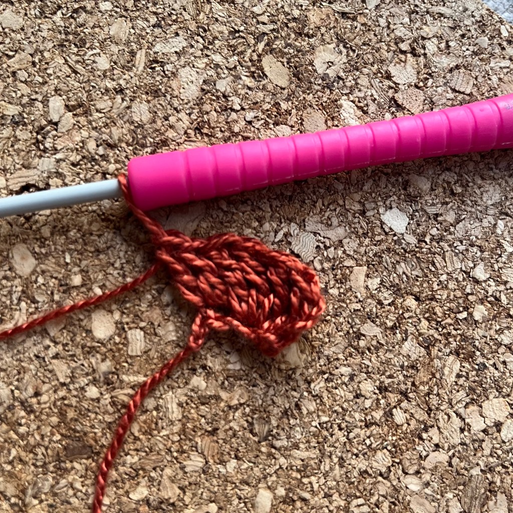 2. Working on the other side of the ch, SC 2 into first ch, DC 2 into next, and TR 4 in next ch. Ch 2 and sl st into the same ch.