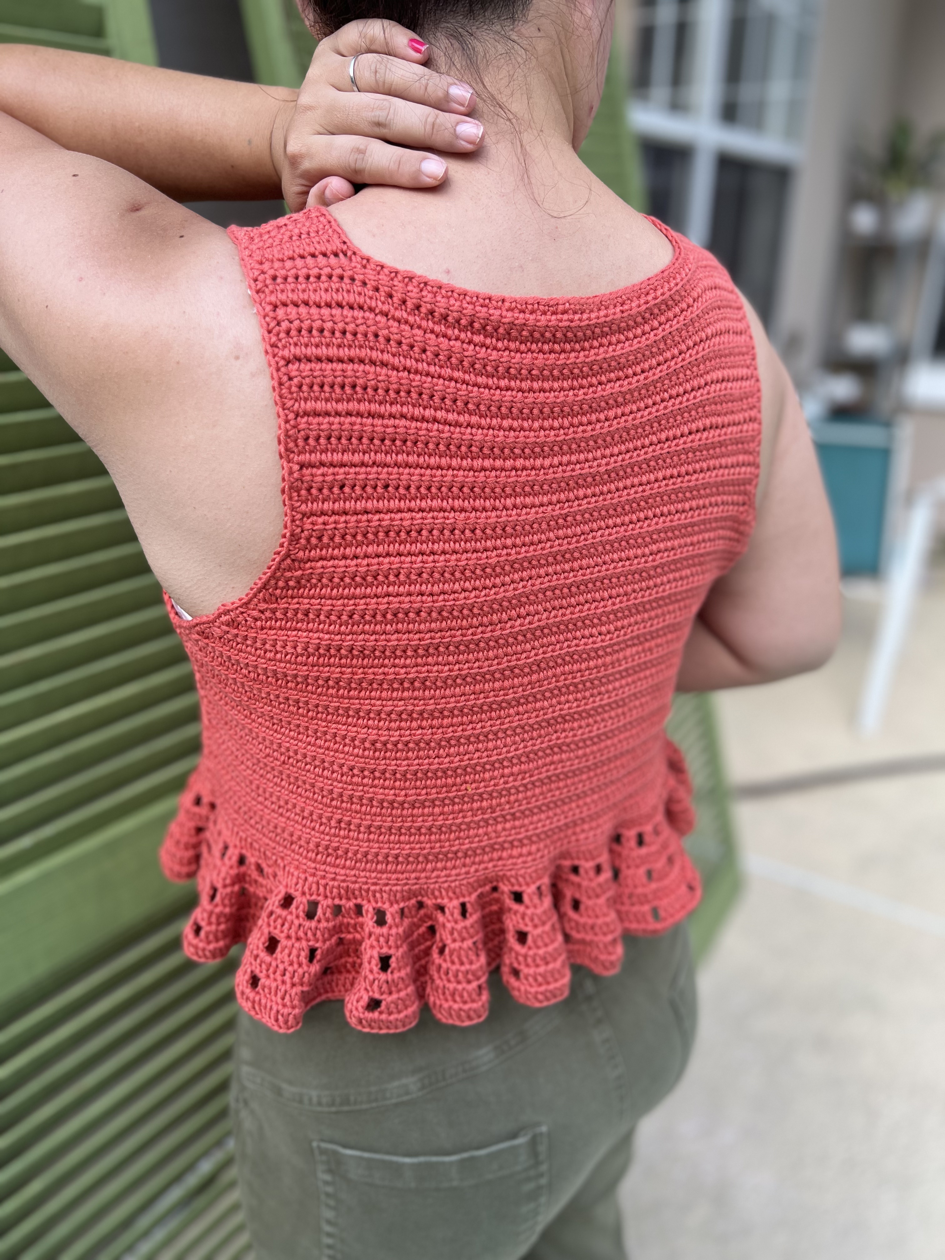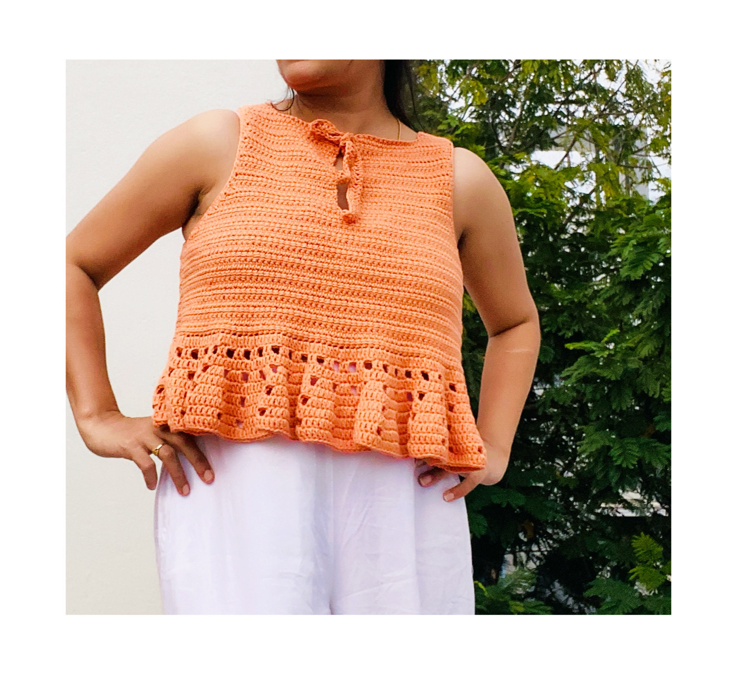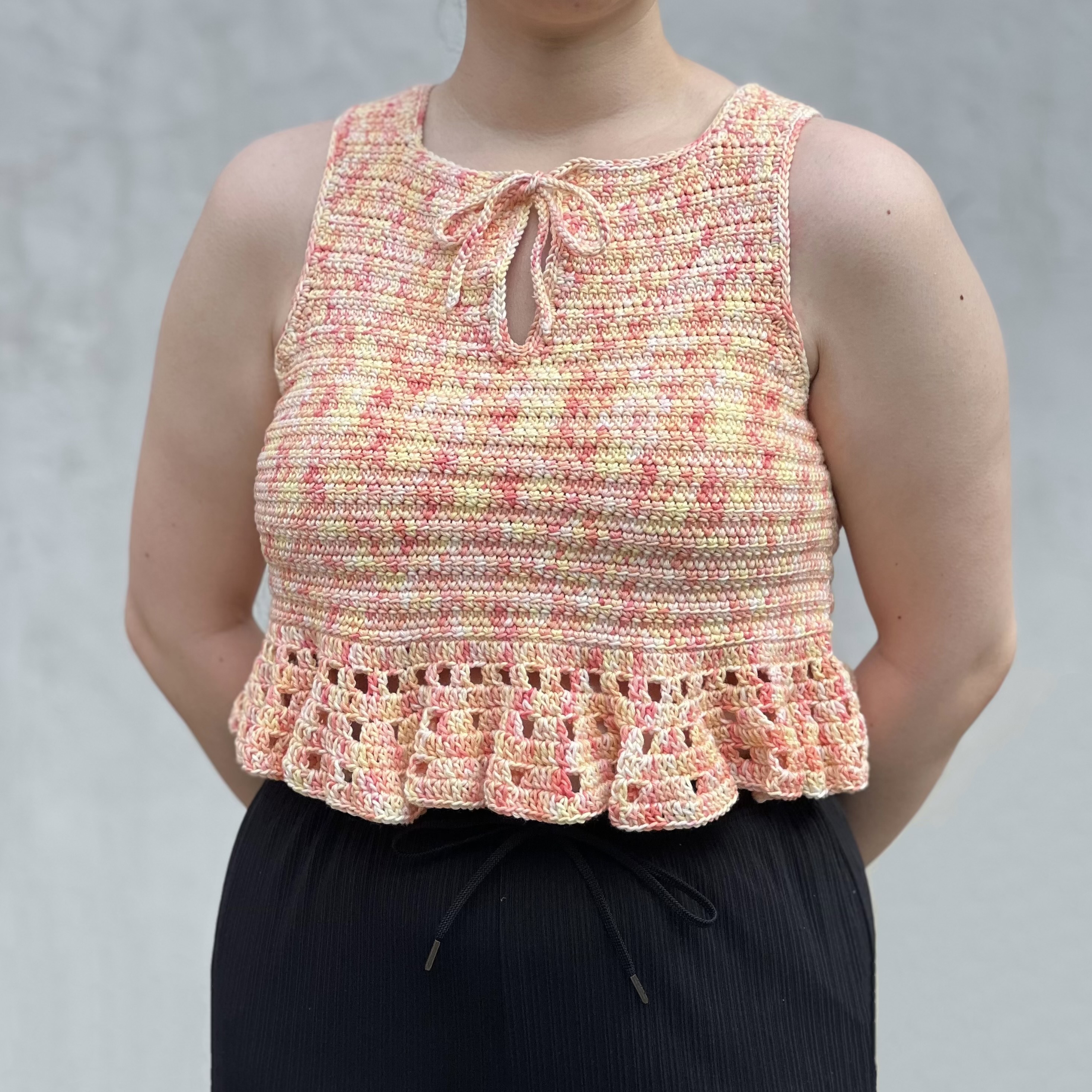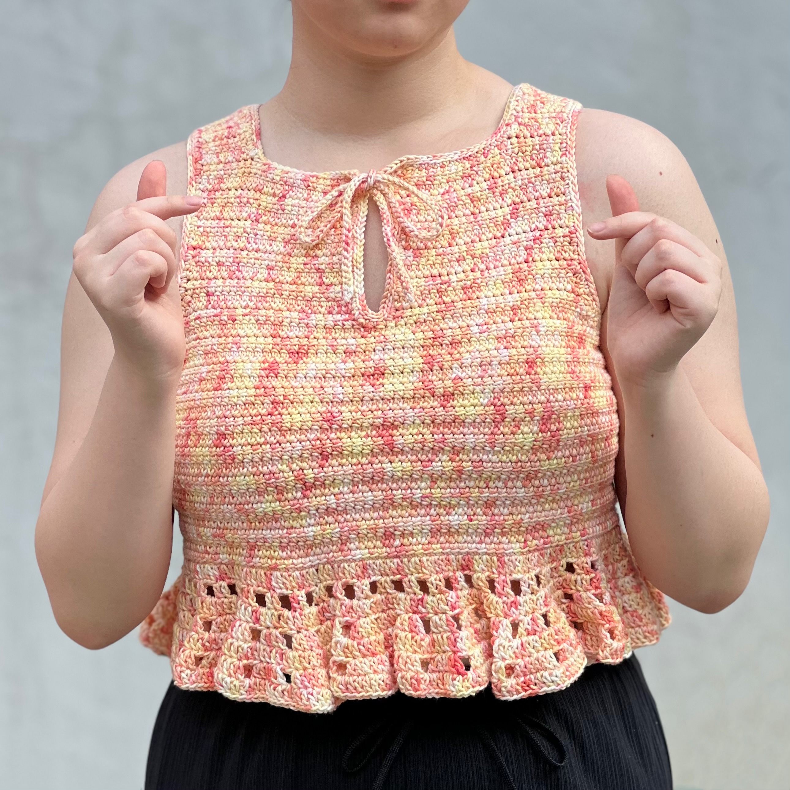 Introducing the ultimate crochet pattern for the perfect peplum tie-front top! This stylish, easy-to-follow pattern is designed to help you create a flattering, versatile top that’s perfect for every season. Made with soft, breathable cotton yarn, this crochet peplum top is a must-have for summer wardrobes—its lightweight feel and sleeveless design make it ideal for sunny days and warm weather. But it doesn’t stop there! Layer this timeless piece over a turtleneck or long-sleeve shirt to enjoy its chic style even in cooler months.
